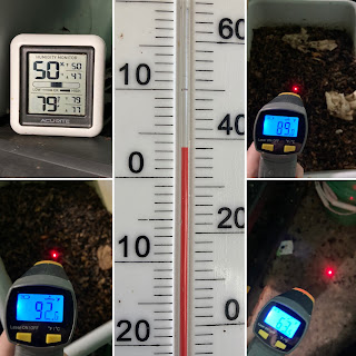I had not run any auxiliary heat, other than the heat bulbs in the fly habitat. The collective heat of the bins sustained temperatures in the 80s. Even the concrete floor hovered around 70 degrees Fahrenheit, only dropping to 40 degrees right at the doorway. I actually had to cool the room in the month of December with and air condition, one of the models that also act as a heat pump and dehumidifier. A standalone dehumidifier works much more effectively to pull moisture from the air, and I purchased one for the larvae room.
